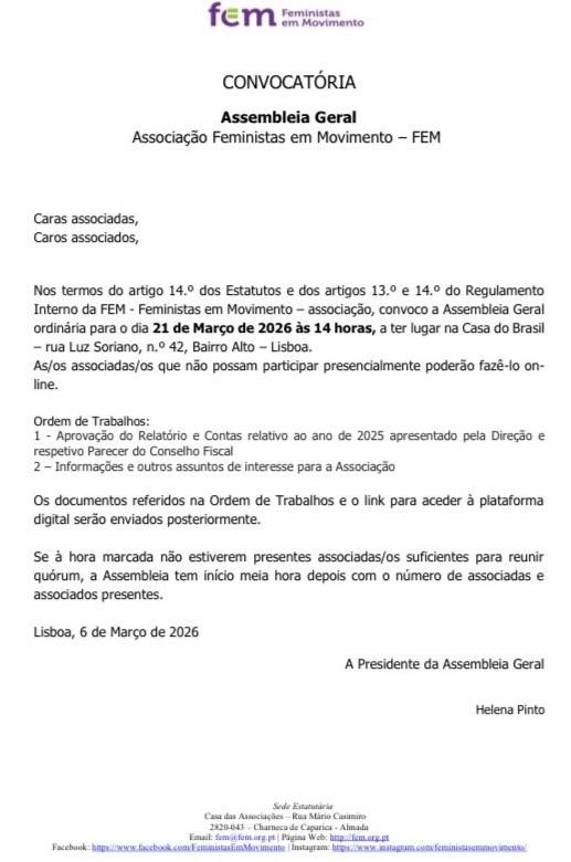 Convocam-se todas/os as/os associadas/as para a Assembleia Geral ordinária, a realizar no dia 21 de março de 2026, às 14h, na Casa do Brasil (Lisboa).